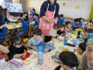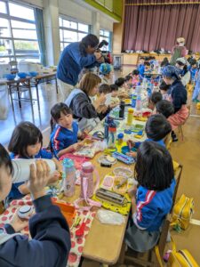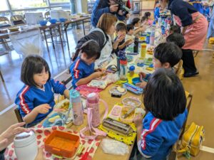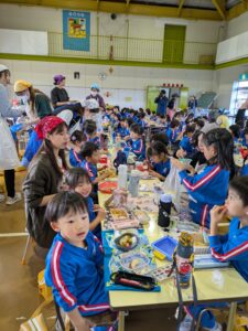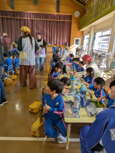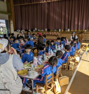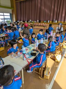 そのあとは、ホールに集まり、みんなでカレー会食!役員さんに配膳のお手伝いをしていただき、たくさん食べました。おいしくておいしくて何度もおかわりをしていました😊