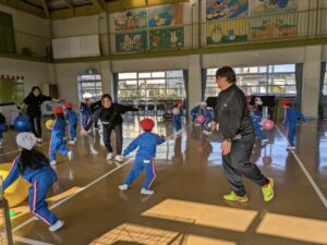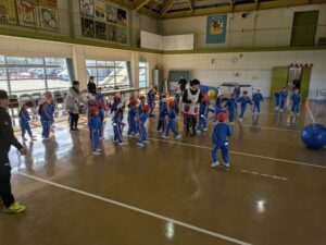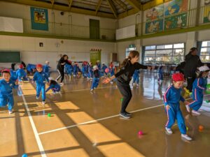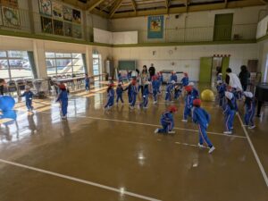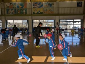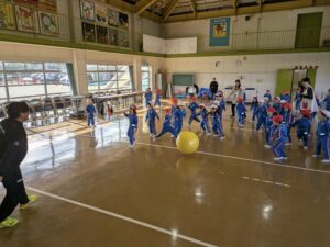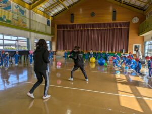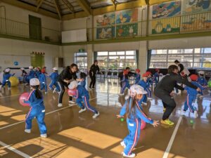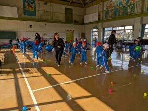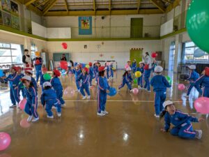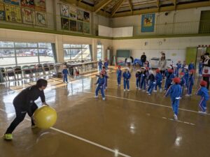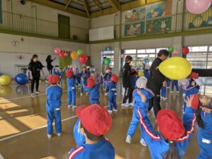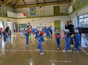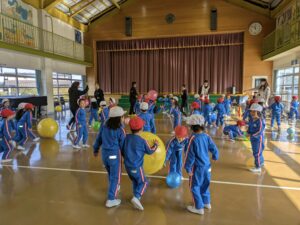 年中組がバルシューレに挑戦しました。『台原バルシューレさん』が楽しい遊びをたくさん教えてくれました。大小さまざまなボールや風船を使って体をいっぱい動かして遊びましたよ。