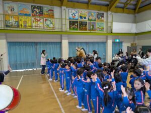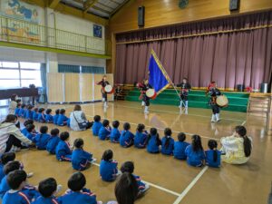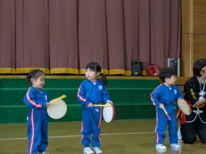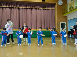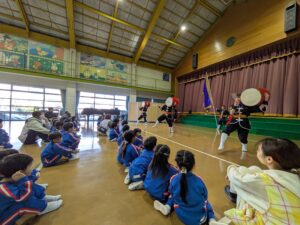 琉球國まつり太鼓の方たちが幼稚園に来てくださいました。迫力のある太鼓に年少さんやプレ年少さんは圧倒されていました。太鼓の音や威勢の良い掛け声、キレのある踊りに、子どもたちは真剣に見入っていましたよ。