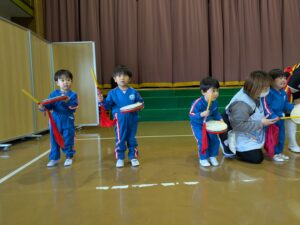 年少・プレ年少はパーラーンクーという手持ちの太鼓を一人ずつ体験。