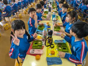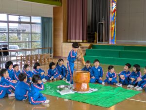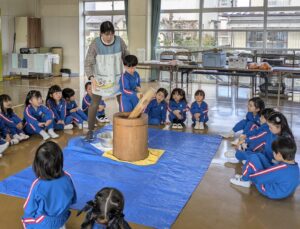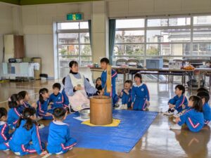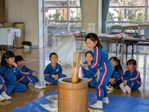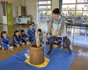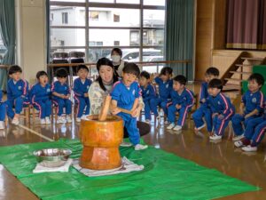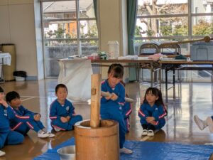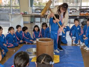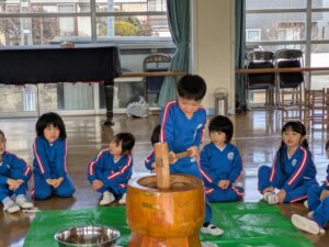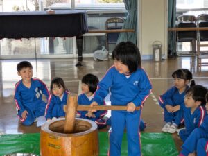 1がつ27日は子どもたちが楽しみにしていたもちつきでした。本物の臼と杵を使い、全員がおもちつきに挑戦しましたよ。