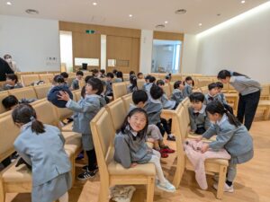 いつもの音色とは違う教会のオルガンの音で讃美歌を歌い、「光の子として歩みなさい」幼稚園最後の聖句を手を付けてみんなで覚えました。